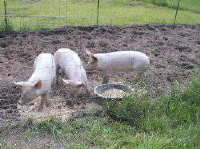 | Pigs turn out to be fun to raise from weaned piglets to succulent pork on the dinner table. They are really amazing animals. Very active, they love to dash around their pen, playing hide and seek like kids. They also dig better than a tiller. We've actually used them to break up sod in areas we wanted to garden, and they also turn fresh sheep bedding and manure into incredibly fertile compost in just a couple of weeks. |